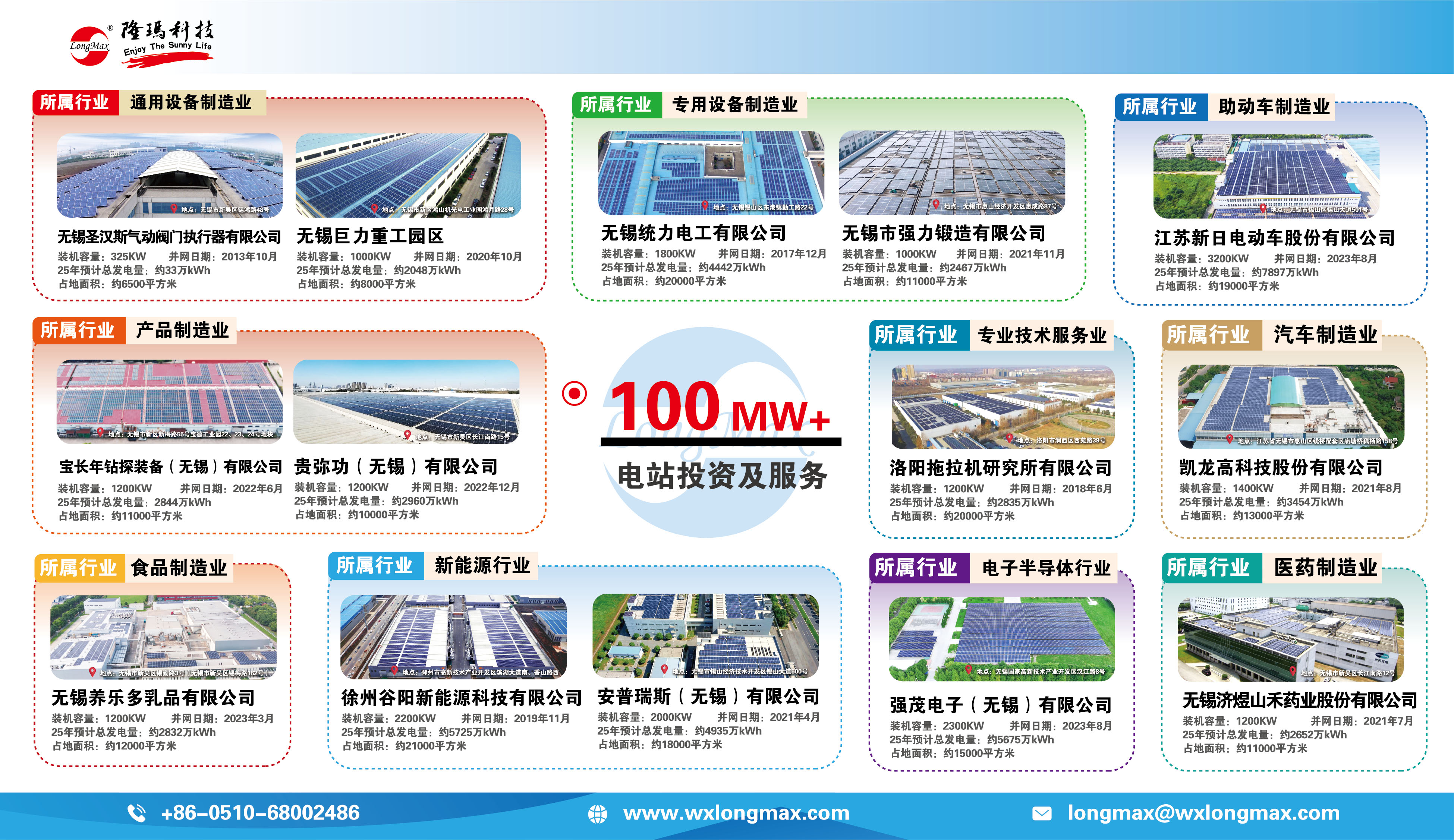 光伏电站累计投资建设及服务超100座,装机总容量超100MW。先后投资建设了统力电工、新日电动车、宝长年钻探装备、养乐多、安普瑞斯、强茂电子、凯龙高科、济煜山禾药业等众多屋顶光伏电站项目。