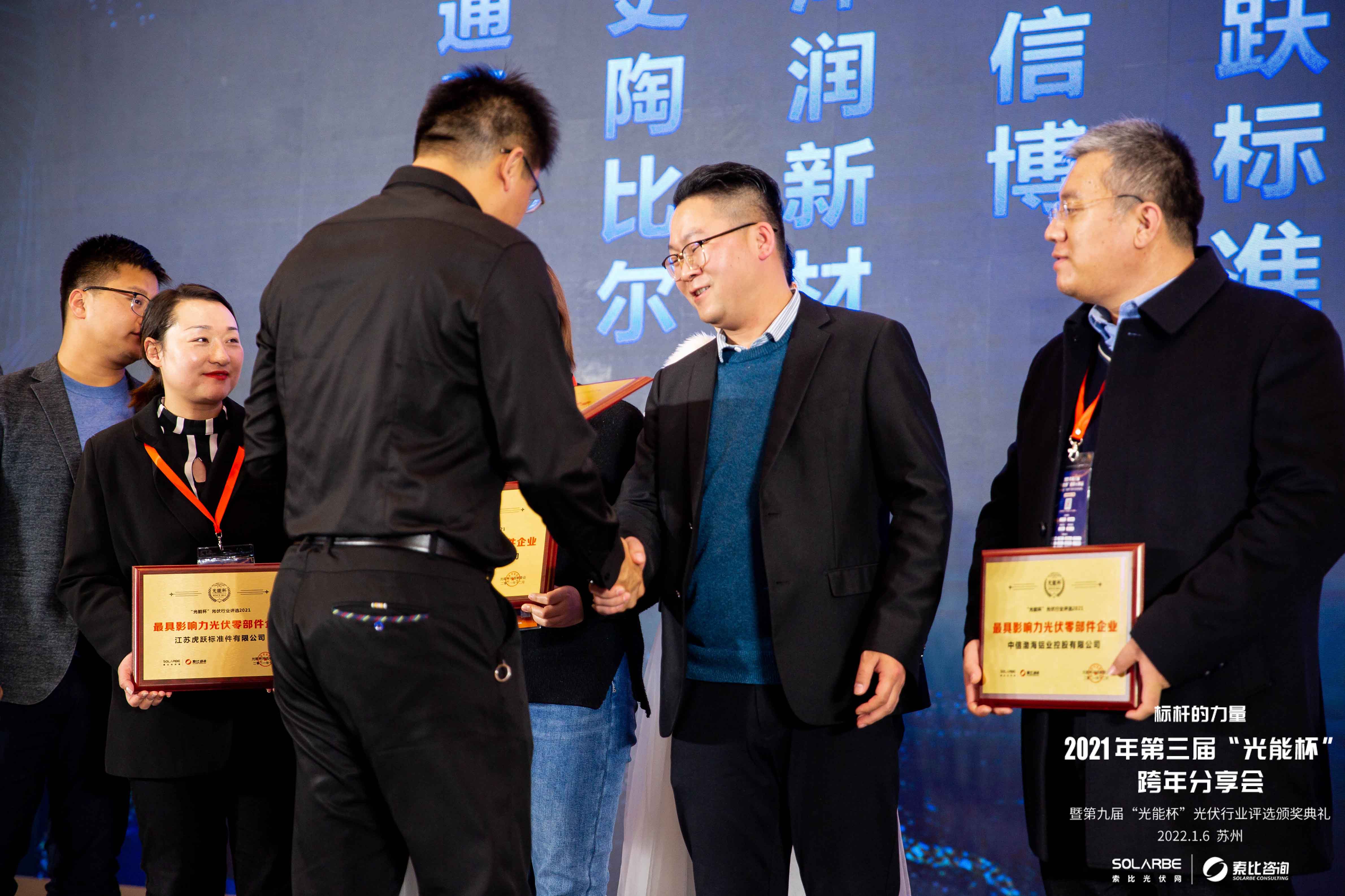 2022年1月6日,由索比光伏网、索比咨询联合主办的2021年度第三届“光能杯”跨年分享会暨第九届光能杯行业颁奖典礼在苏州如期举行。本届“光能杯”共有300余家光伏企业参与报名评选,旨在挖掘行业中坚力量,树立行业标杆,表彰在过去一年中对于光伏行业做出突出贡献和具有表率作用的卓越企业以及优秀管理者,推动行业转型升级健康发展。我司凭借强大创新力、出色的品质与服务、卓越的品牌影响力,蝉联2021年 “最具影响力光伏零部件企业” 大奖。
