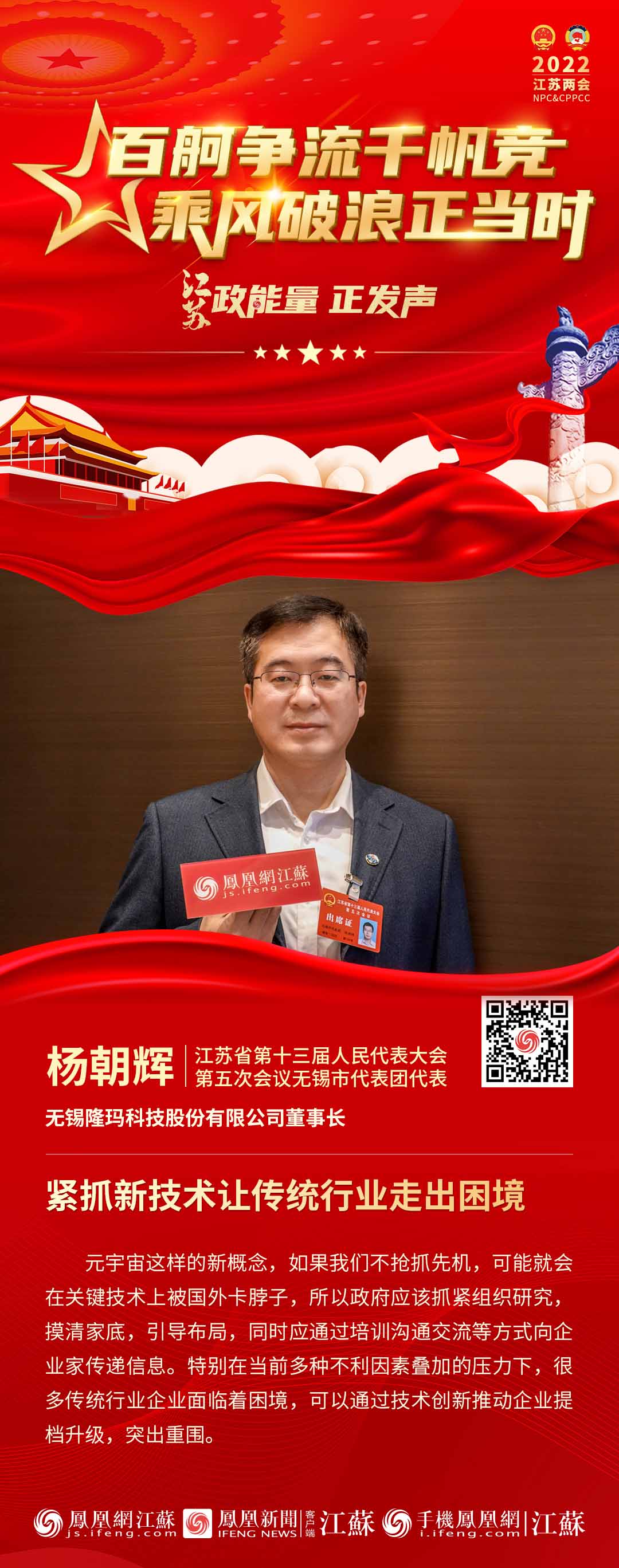 在大会发言中,杨朝辉建议省市有关部门关注和重视当下最新技术如何和现有产业结合的问题,比如时下最新的元宇宙的概念,杨朝辉表示,“元宇宙这样的新概念,如果我们不抢抓先机,可能就会在关键技术上被国外卡脖子,所以政府应该抓紧组织研究,摸清家底,引导布局,同时应通过培训沟通交流等方式向企业家传递信息。特别在当前多种不利因素叠加的压力下,很多传统行业企业面临着困境,可以通过技术创新推动企业提档升级,突出重围”。