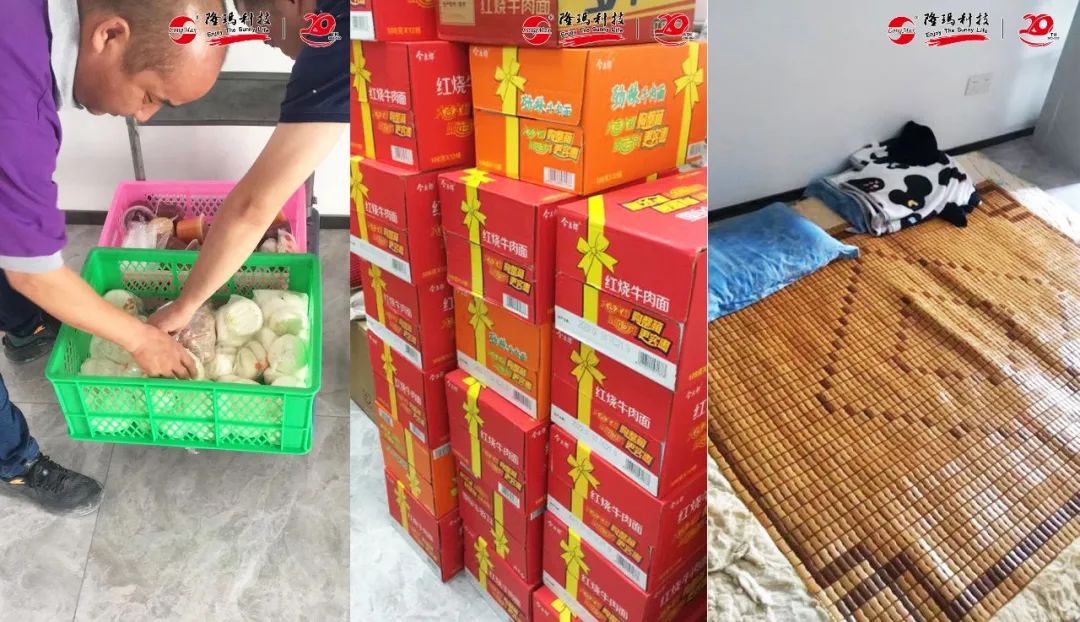 因疫情来得突然给到大家应对的时间短,公司又没有现成的员工宿舍,当公司驻厂决策通知一发出来,很多管理人员连夜赶回家把家中的物资收集起来贡献给公司员工用。