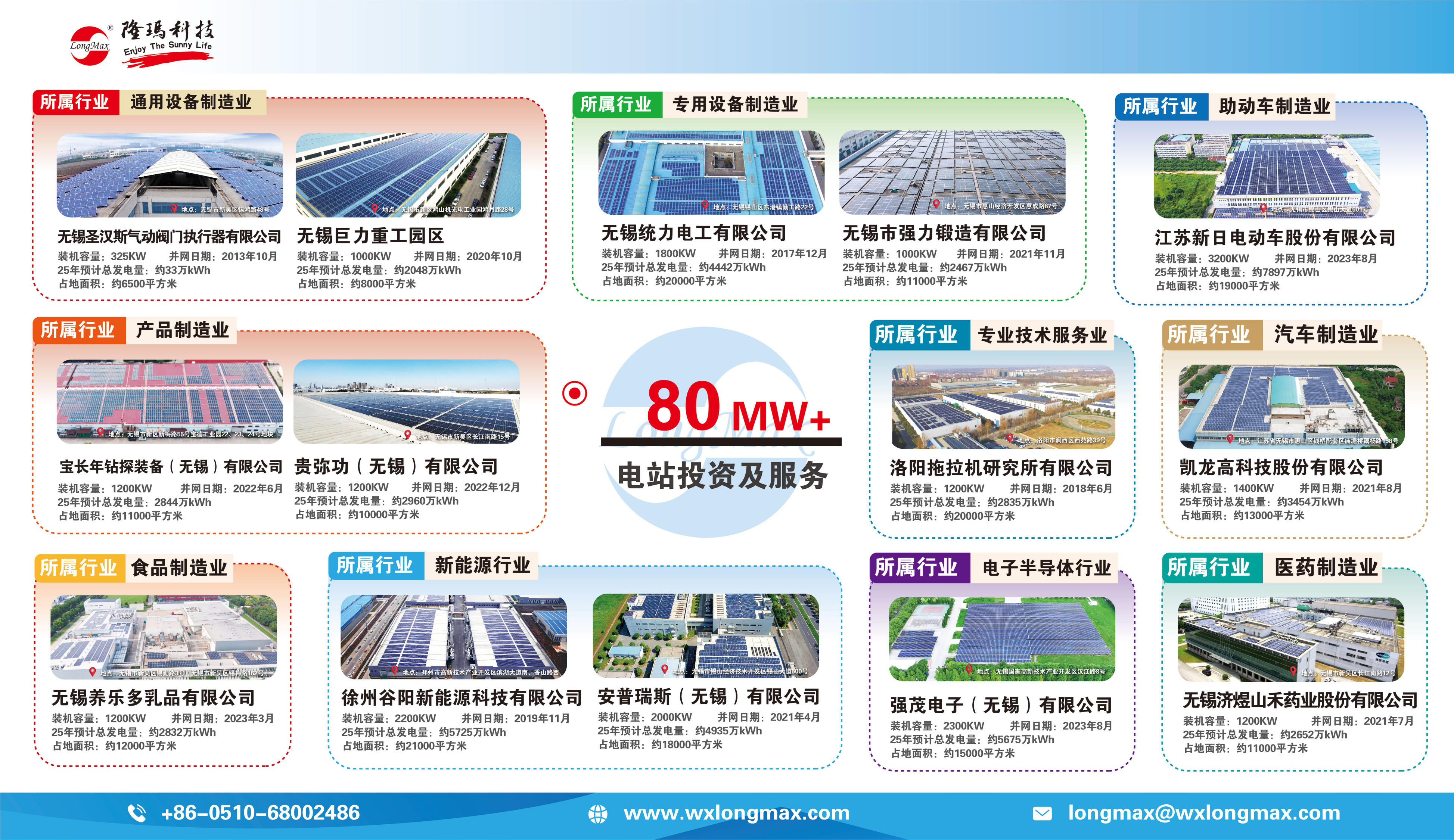 光伏电站累计投资建设及服务超100座,装机总容量超1000MW。先后投资建设了统力电工、新日电动车、宝长年钻探装备、养乐多、安普瑞斯、强茂电子、凯龙高科、济煜山禾药业等众多屋顶光伏电站项目。