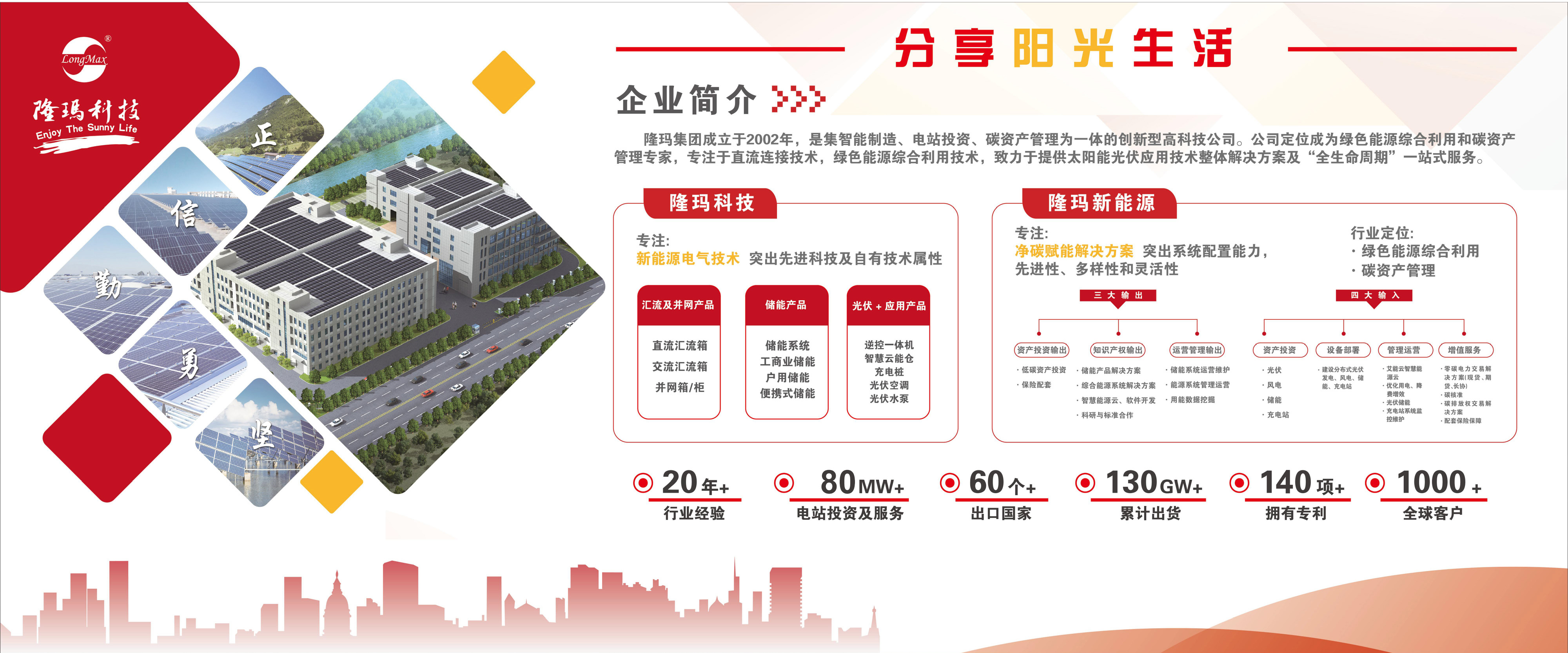成立20多年来,公司以“分享阳光生活”为企业愿景,以“科技创新”为动力,以“市场需求”为导向,以“技术领先、品质保证、服务优异”为发展基石,不断开拓进取。获评国家级专精特新“小巨人”、江苏省专精特新企业、江苏省高新技术企业。各类专利超过130项,高新技术产品6项。公司通过IS09001、IS014001、IS045001体系认证,产品通过UL、TUV、CE、CQC等国内外认证,服务超过1000家全球客户,销往欧洲、美洲、日本、澳大利亚、越南、菲律宾、埃及、南非等全球60多个国家和地区。目前是全球最大的光伏汇流箱生产出货公司之一。累计出货超100GW。
