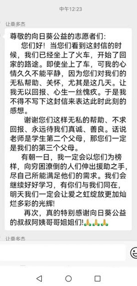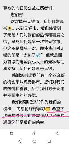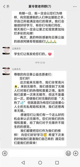 “远方少年无锡游”活动不仅是一次简单的旅行,更是一次成长的历练。它让少年们在探索中收获了知识,在体验中感受了文化,在分享中增进了友谊。在活动结束后,向日葵公益的志愿者老师们收到了少年们在返程火车上发来的感谢信,他们用真诚质朴的语言表达着感激,诉说着未来。相信这段美好的经历已将希望悄悄播种,将会在他们人生旅途中开出绚烂之花。