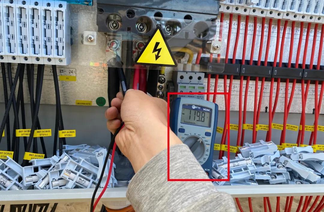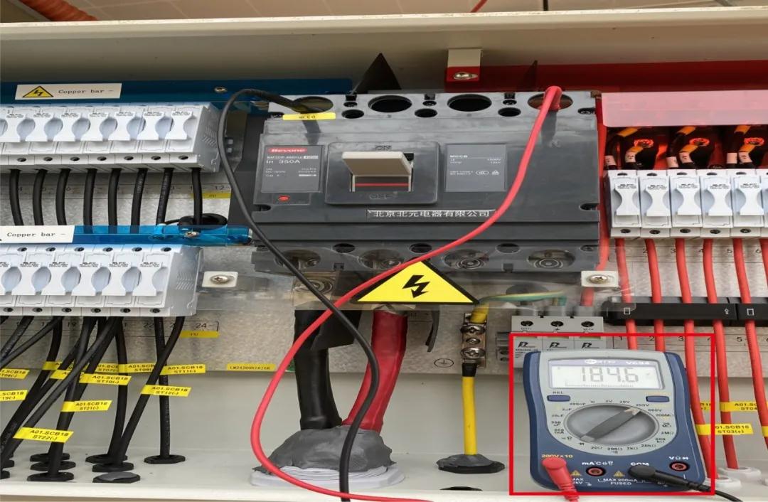 用万用表测每路组串正极和对应的组串负极的开路电压(如1+与1- ... 24+与24-),确保每个组串均有开路电压,且每路开路电压偏差建议不超过±10V,并做好相应记录。