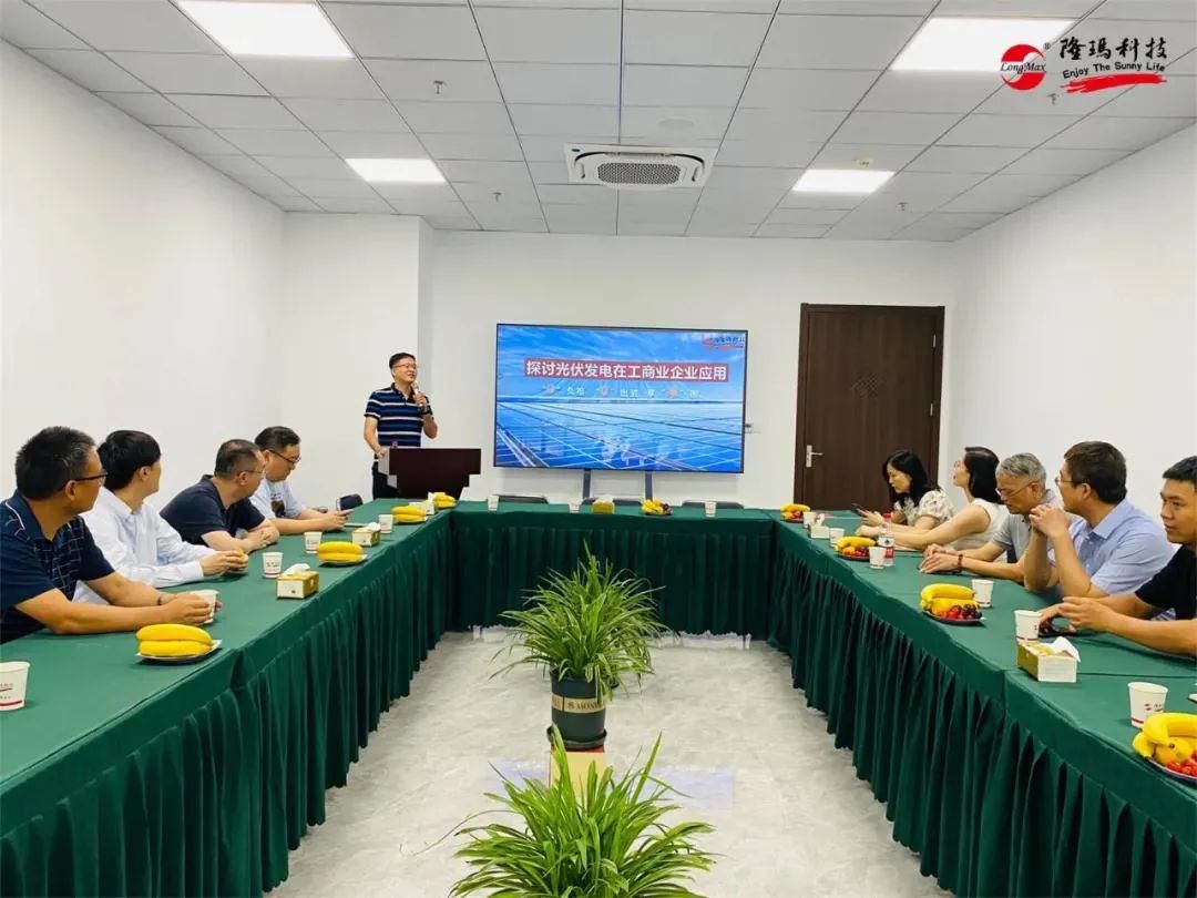 参观完毕后,我司总经理 杨宇辉向各位领导介绍了公司基本情况、研发成果和未来“花园式工厂”的规划,同时进行了“探讨光伏发电在工商企业应用”的主题汇报。座谈会上总经理杨宇辉介绍了光伏行业的最新市场前景和应用方案,分析了光伏行业的最新趋势及上下游产业的总体发展情况。